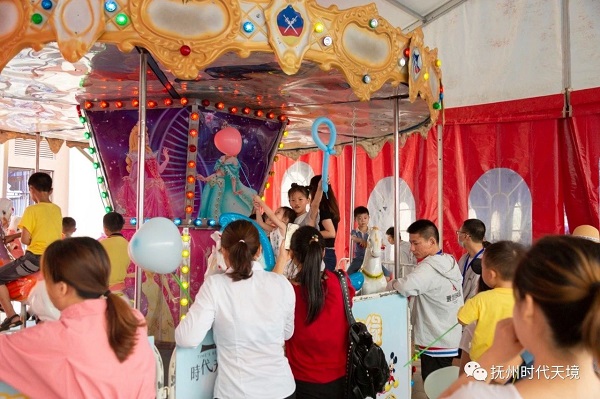 大家忙著玩旋轉(zhuǎn)木馬、小熊維尼、瘋狂賽車、充氣城堡