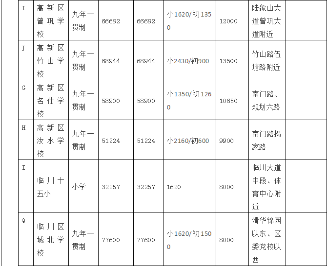 臨川遠(yuǎn)期臨川城區(qū)主要以新建學(xué)校作為對教育資源的補(bǔ)充,新建4所小學(xué),為東岸小學(xué)、站前三小、陳家小學(xué)、贛閩小學(xué);新建3所九年一貫制學(xué)校,為河濱學(xué)校、城南學(xué)校、城南第二學(xué)校;擴(kuò)建1所小學(xué),為謝家小學(xué);新建1所完全中學(xué),為高新區(qū)完全中學(xué);新建1所職業(yè)高中,為臨川二職。