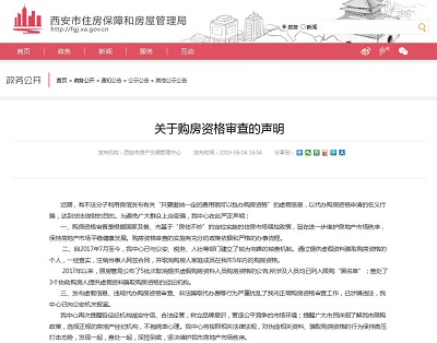 繼陜西住建廳發(fā)布《進(jìn)一步加強(qiáng)商品房預(yù)售管理工作》之后,6月4日下午,西安市房產(chǎn)交易管理中心發(fā)布《關(guān)于購(gòu)房資格審查的聲明》(以下簡(jiǎn)稱“聲明”),強(qiáng)調(diào)購(gòu)房資格審查,通過(guò)提供虛假資料騙取購(gòu)房資格的個(gè)人,取消購(gòu)房人家庭成員在西安市5年內(nèi)的購(gòu)房資格。